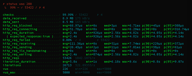 2000, 3000, 4000, 5000이 각 10s동안 요청이 가도록 설정하였고, 성능적으로 생각보다 느린 것을 확인할 수 있습니다.