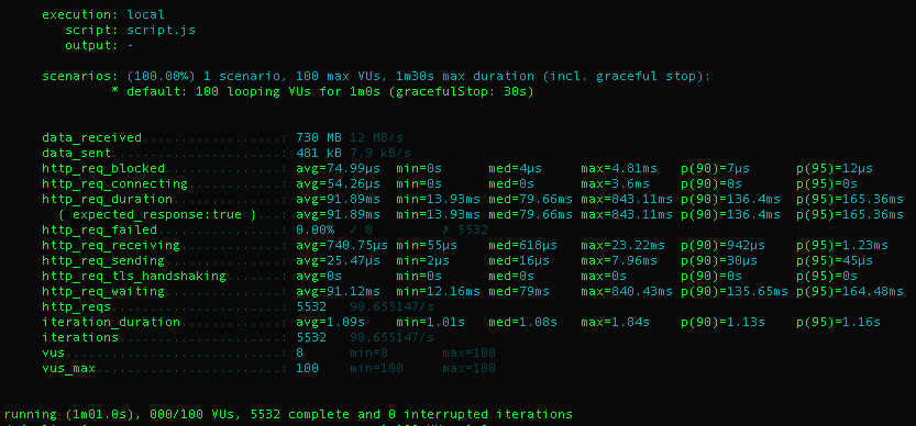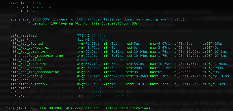 Paiging을 적용 후 TPS를 측정해 보았을 때 1m 동안 5900건의 트래픽을 처리하였으므로 5900/60 = 98.3... 약 98 TPS의 성능이 나왔습니다. 즉, 5배 이상 되는 성능이 향상된 것을 확인해 볼 수 있었습니다.